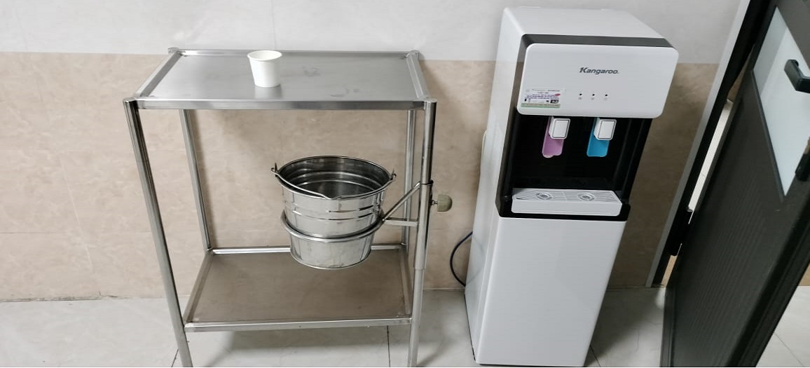 Giám đốc bệnh viện Đa khoa Việt Đức, ông Hoàng Công Lâm, chỉ cho chúng tôi xem ở mỗi phòng bệnh đều có một cây nước cung cấp cho mọi người. Bệnh nhân hay ai đó có nhu cầu, chỉ cần sử dụng cốc giấy có sẵn để uống nước.