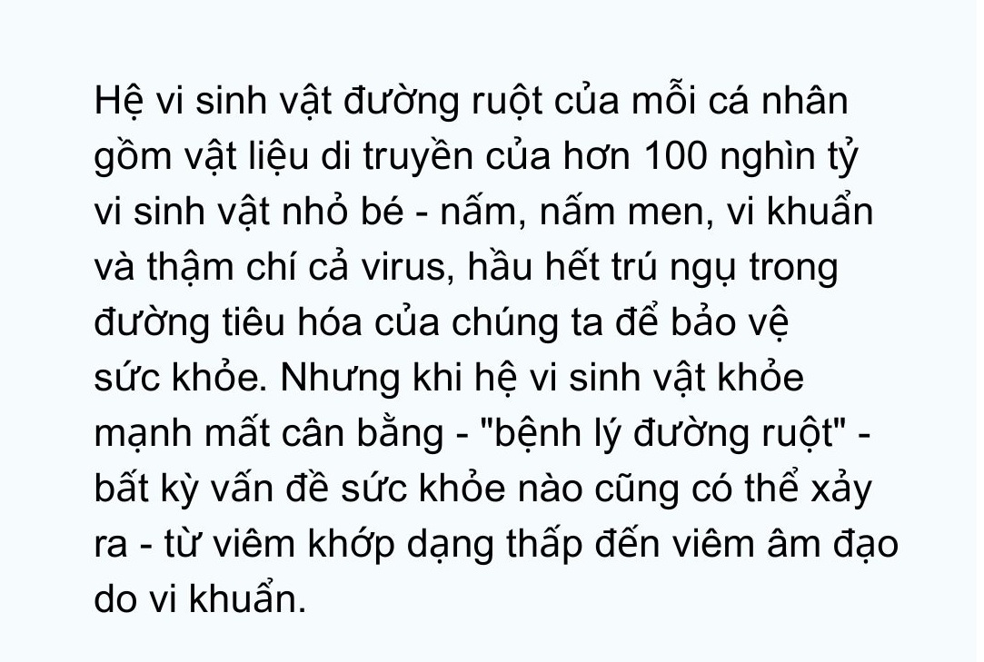 Hệ vi sinh vật đường ruột của mỗi cá nhân gồm vật liệu di truyền của hơn 100 nghìn tỷ vi sinh vật nhỏ bé – nấm, nấm men, vi khuẩn và thậm chí cả virus, hầu hết trú ngụ trong đường tiêu hóa của chúng ta để bảo vệ sức khỏe. Nhưng khi hệ vi sinh vật khỏe mạnh mất cân bằng – “bệnh lý đường ruột” – bất kỳ vấn đề sức khỏe nào cũng có thể xảy ra – từ viêm khớp dạng thấp đến viêm âm đạo do vi khuẩn.