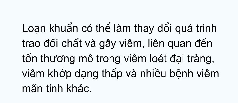 Khi hệ vi sinh vật không còn khỏe mạnh, do xâm nhập của tác nhân gây bệnh bên ngoài, hoặc do thay đổi lớn về số lượng các loài vi khuẩn hiện diện, tình trạng loạn khuẩn, hay mất cân bằng hệ vi sinh vật, sẽ xảy ra. Loạn khuẩn có thể làm thay đổi quá trình trao đổi chất và gây viêm, liên quan đến tổn thương mô trong viêm loét đại tràng, viêm khớp dạng thấp và nhiều bệnh viêm mãn tính khác.