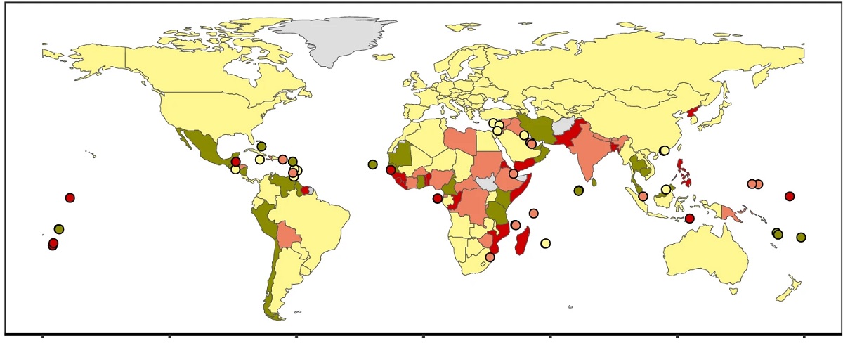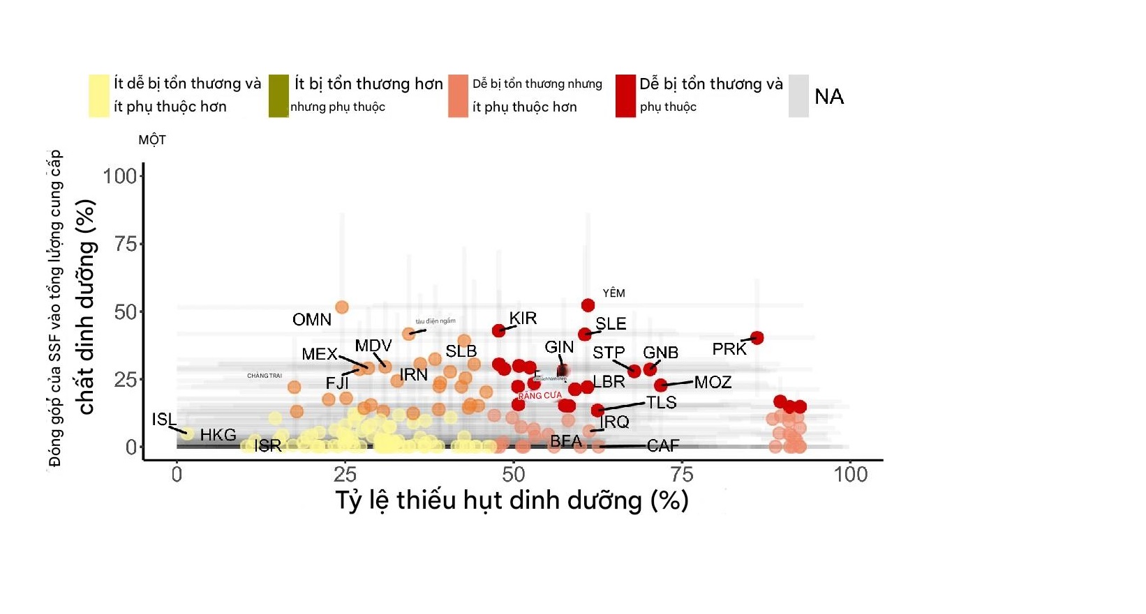 Các quốc gia có tỷ lệ cao về lượng vi chất dinh dưỡng không đầy đủ (dễ bị tổn thương) và phụ thuộc vào SSF để cung cấp các chất dinh dưỡng chính (phụ thuộc). Các quốc gia được coi là dễ bị tổn thương về mặt dinh dưỡng là những quốc gia nằm trong khoảng phần trăm thứ 70 và 100 về tỷ lệ lượng vi chất dinh dưỡng không đầy đủ | Nguồn: nature
