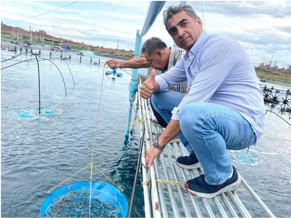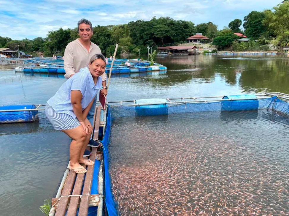 Castillo với khách hàng tại trang trại cá rô phi ở Rayong, Thái Lan