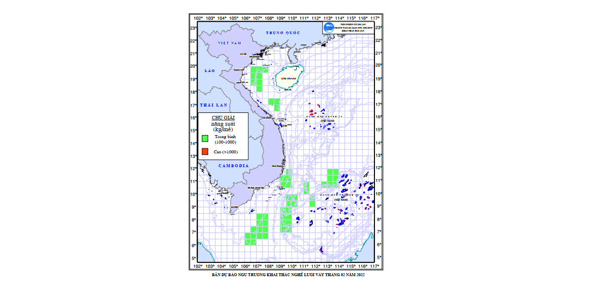 Căn cứ vào bản tin dự báo ngư trường tháng 2 năm 2025 của Trung tâm Dự báo ngư trường khai thác hải sản thuộc Viện Nghiên cứu Hải sản, thông báo về tình hình ngư trường khai thác đối với nghề lưới Vây trong tháng 2 năm 2025.