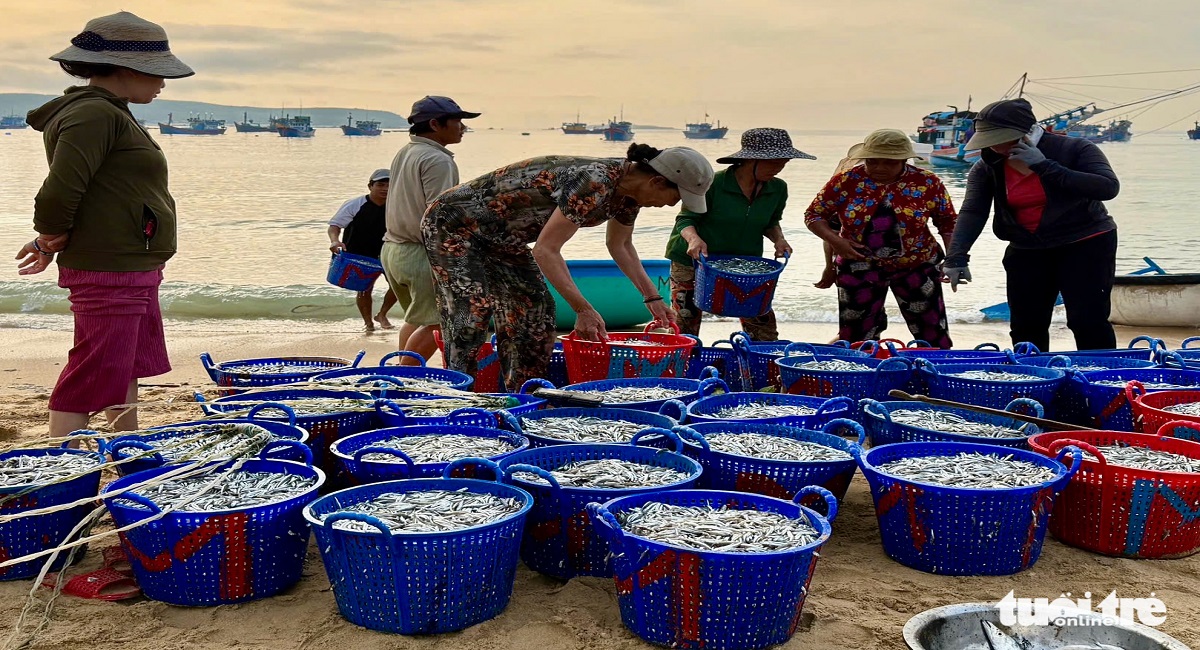 Từ 5h sáng mỗi ngày, nhiều phụ nữ tại xã An Chấn (huyện Tuy An, Phú Yên) lại đợi sẵn trên bãi biển chờ những thúng cá cơm tươi rói được đưa vào bờ.