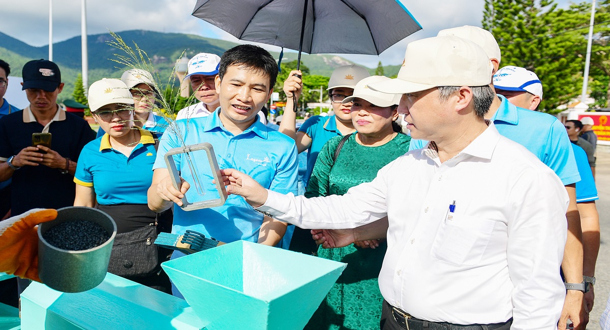Đại diện Công ty CP Lagom Việt Nam giới thiệu các sản phẩm từ rác tái chế với ông Đặng Minh Thông, Phó Chủ tịch UBND tỉnh trong khuôn khổ “Ngày hội Côn Đảo xanh”