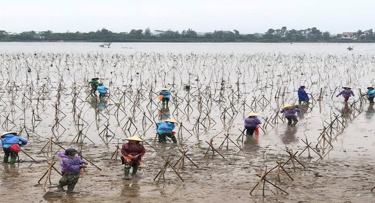 Hình ảnh người dân trồng rừng ngập mặn – một mô hình EbA (thích ứng dựa vào hệ sinh thái) đã được nhân rộng tại Bắc Trung Bộ. Rừng ngập mặn không chỉ giảm sóng mạnh khi bão quét qua vùng ven biển, mà còn tạo sinh kế mới và hấp thụ CO₂ – bài học sống từ đại dương trong cách “hòa hợp tự nhiên” | Nguồn: UNDP Climate Change Adaptation