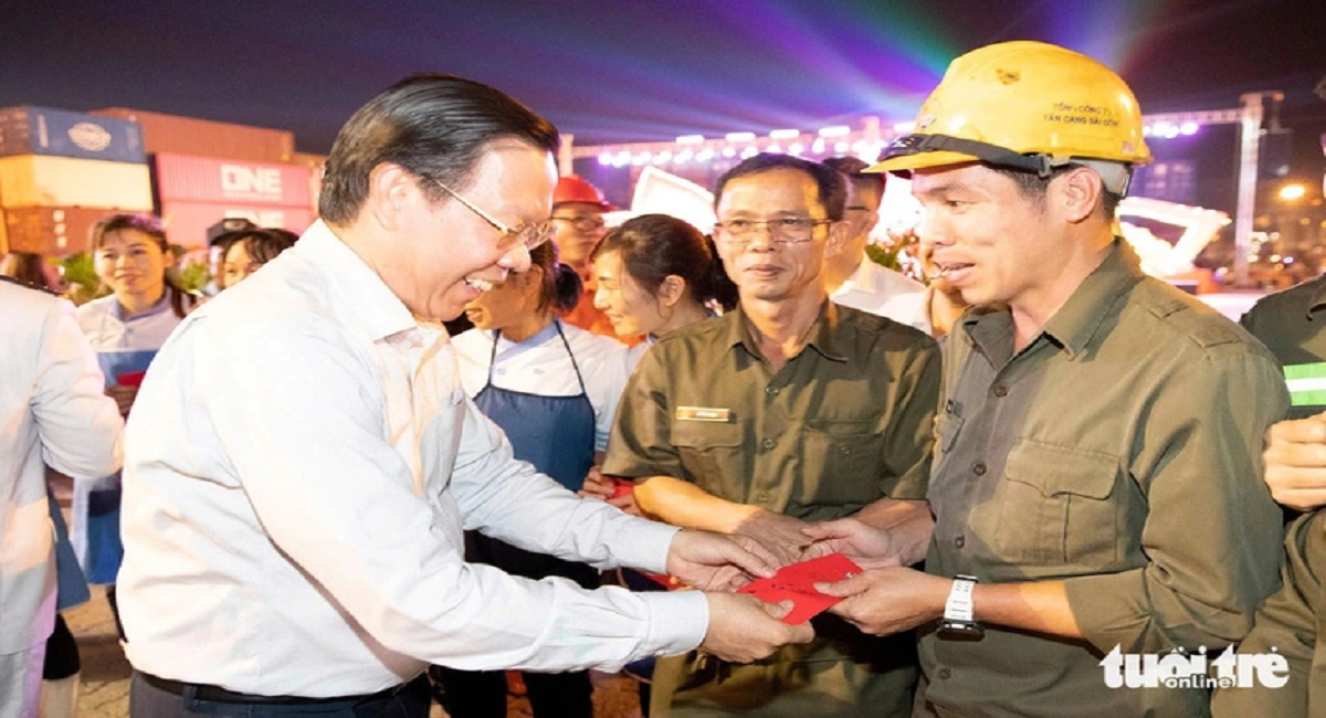 Ông Phan Văn Mãi, chủ tịch UBND TP.HCM, lì xì đầu năm mới cho các cán bộ đảm nhận ca trực đêm giao thừa | N.BÌNH