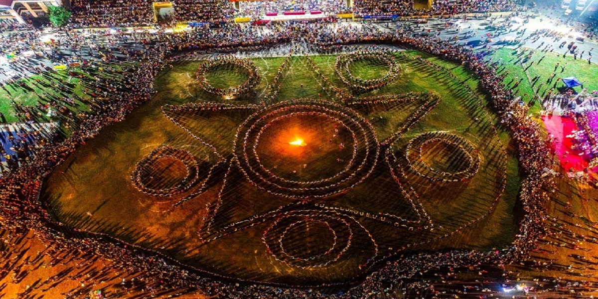 Vòng xoè đoàn kết gồm 2500 người tham gia của Nhân dân các dân tộc huyện Than Uyên trong Tết Độc lập 2023