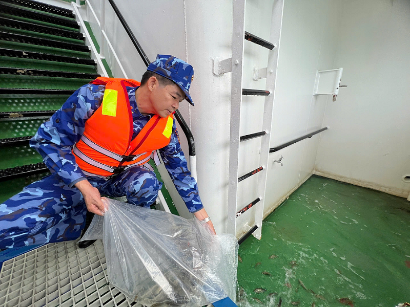 Khi tàu vừa rời cảng lên đường hành quân, Hải đoàn 11 đã triển khai quán triệt một số quy định trong quá trình thực hiện nhiệm vụ. Trên đường hành trình ra khu vực đợi cơ, đoàn đã tổ chức thả hơn 20.000 con cá chẽm, cá đối mục, cua biển giống xuống Vịnh Bắc bộ. Đây là hoạt động nhằm tái tạo nguồn lợi thuỷ sản, duy trì sự phát triển đa dạng sinh học trong vùng biển Vịnh Bắc Bộ của Việt Nam.