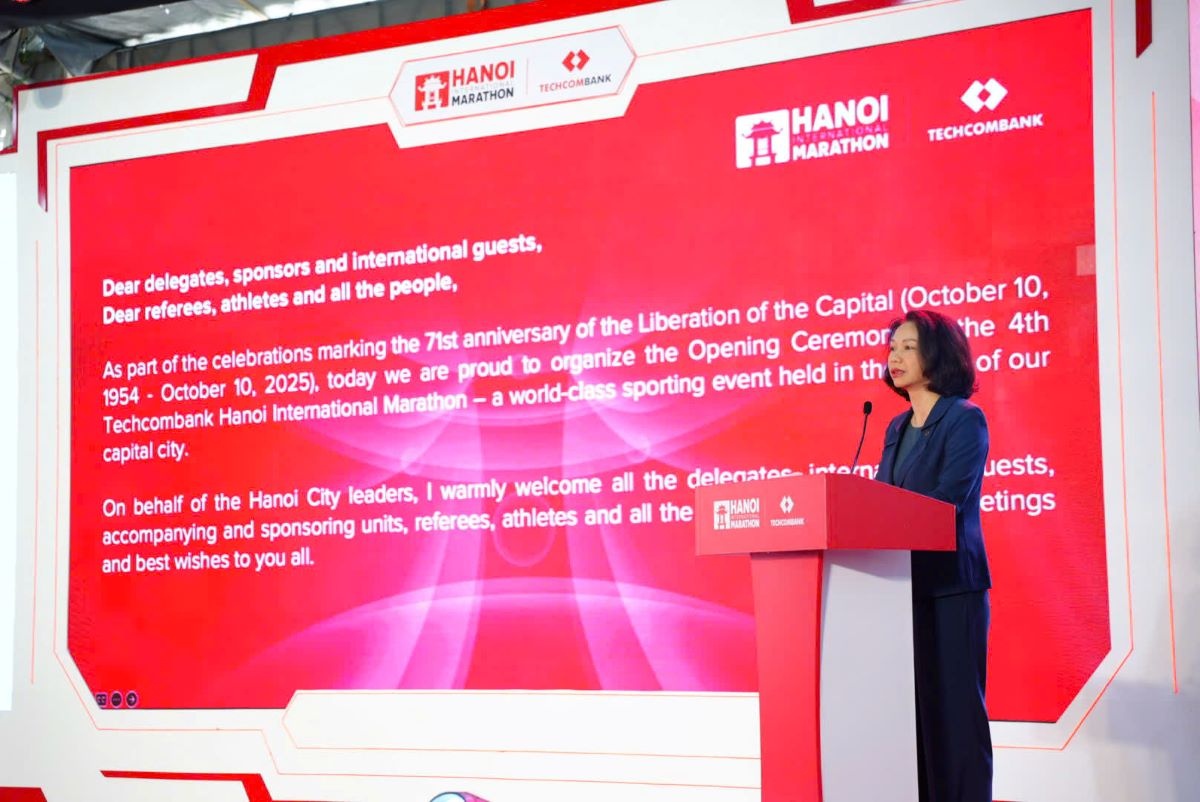 Phát biểu tại Lễ khai mạc, Bà Vũ Thu Hà, Phó Chủ tịch UBND Thành phố Hà Nội, khẳng định: “Tiếp theo thành công của các mùa giải trước, mùa giải lần thứ 4 – năm 2025, Giải Marathon Quốc tế Hà Nội Techcombank tiếp tục khẳng định vị thế của Hà Nội trên bản đồ thể thao khu vực và thế giới. Giải không chỉ đơn thuần là một cuộc đua, mà còn là hành trình để mỗi vận động viên và người dân cảm nhận nhịp sống sôi động, cảnh quan tươi đẹp và những giá trị văn hóa ngàn năm của Thủ đô văn hiến. Thành phố Hà Nội sẽ chỉ đạo các sở, ngành, địa phương thuộc Thành phố phối hợp chặt chẽ cùng Ban tổ chức để đảm bảo giải chạy diễn ra an toàn, chuyên nghiệp, chu đáo và đầy ấn tượng đối với vận động viên, nhân dân Thủ đô và bạn bè quốc tế.”