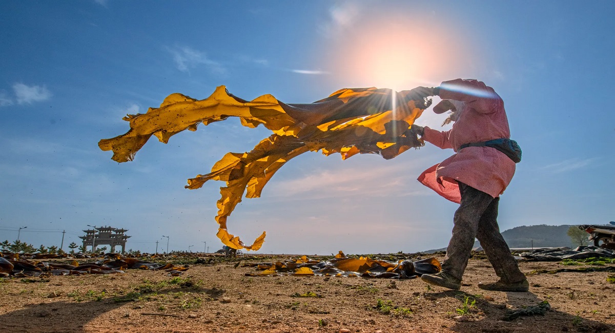 Một người nông dân đang phơi tảo bẹ ở Rongcheng, tỉnh Sơn Đông, Trung Quốc | Liu Guoxing/VCG
