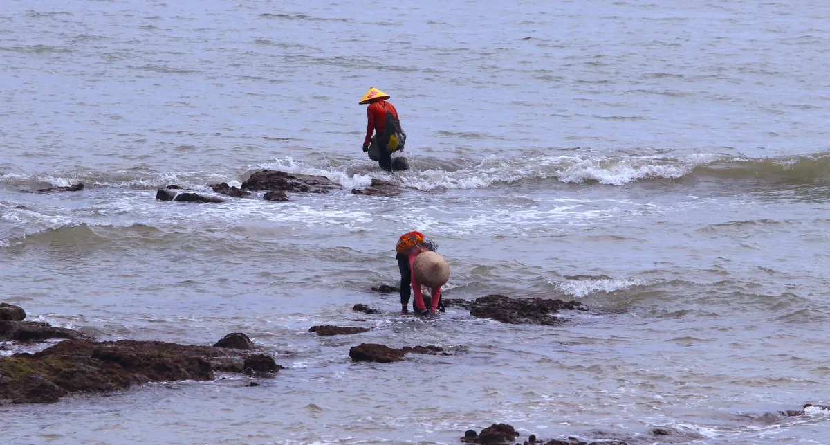 Chân dò dẫm bước đi trên bãi đá ngầm, mắt nhìn vị trí rong biển sinh sống. Khi sóng biển rút đi lộ ra đám rong biển bám ở mặt đá, những bàn tay nhanh thoăn thoắt vội chộp lấy. Nếu chậm, sóng biển sẽ cuốn rong đi mất.