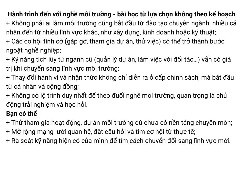 Nếu bạn đang băn khoăn về hành trình nghề nghiệp, đặc biệt khi muốn chuyển sang lĩnh vực môi trường, câu chuyện dưới đây có thể là gợi mở thực tế. Đang quản lý dự án trong ngành xây dựng, một nhân sự tại Lào từng bước tìm hướng đi mới thông qua các cơ hội tình cờ và trải nghiệm thực địa. Bài giúp độc giả hiểu không có lộ trình duy nhất, nhưng luôn có những cách để bắt đầu.