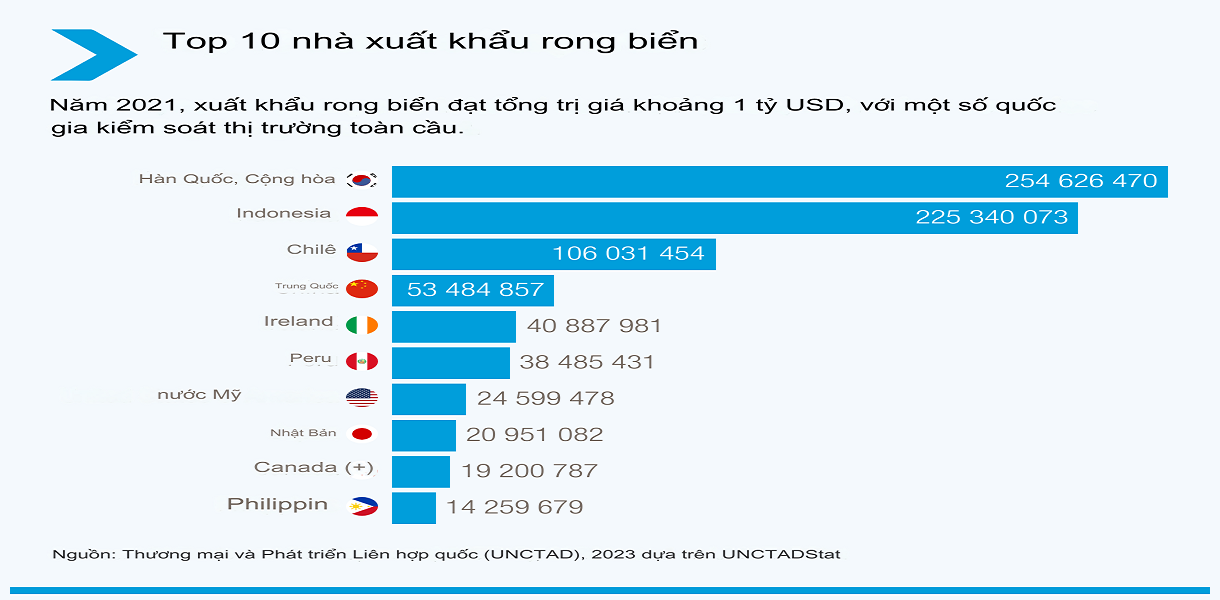 Dữ liệu về Thương mại và Phát triển của Liên hợp quốc cho thấy thị trường rong biển toàn cầu đã tăng hơn gấp ba lần trong hai thập kỷ qua, từ 5 tỷ USD năm 2000 lên 17 tỷ USD vào năm 2021, khi xuất khẩu toàn cầu của ngành này lên tới khoảng 1 tỷ USD.