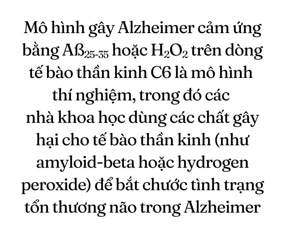 Từ 23 cao chiết, nhóm nghiên cứu tiếp tục sàng lọc 11 cao chiết có khả năng bảo vệ tế bào thần kinh, chống độc tính tế bào trong mô hình gây Alzheimer cảm ứng bằng Aß25-35 hoặc H2O2 trên dòng tế bào thần kinh C6 (mô hình thí nghiệm, trong đó các nhà khoa học dùng các chất gây hại cho tế bào thần kinh (như amyloid-beta hoặc hydrogen peroxide) để bắt chước tình trạng tổn thương não trong Alzheimer), dựa trên cơ chế rối loạn thần kinh, suy giảm thần kinh do mảng bám protein beta-amyloid (một đoạn protein được cơ thể sản xuất và đóng vai trò trong bệnh Alzheimer) trên não.