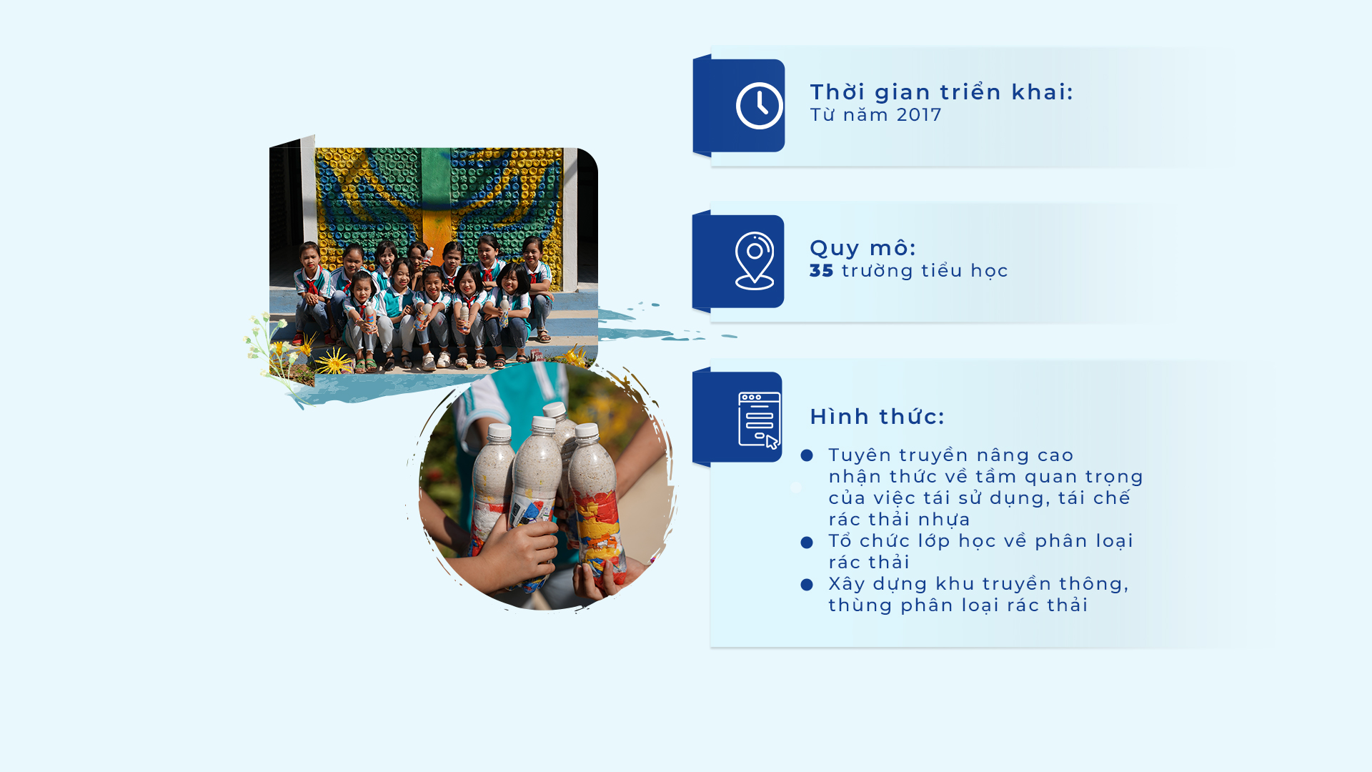 Hiểu rõ nền tảng thay đổi hành động bắt đầu từ ý thức, đặc biệt với thế hệ trẻ, Suntory PepsiCo Việt Nam kết hợp Hội Đồng đội Trung ương tổ chức “Ngày hội tái chế – Hiệp sỹ MIZU bảo vệ môi trường” trong khuôn khổ chương trình “Mizuiku – Em yêu nước sạch”. Hoạt động triển khai tại 35 trường tiểu học, hướng đến giúp học sinh nâng cao nhận thức về tầm quan trọng của việc tái sử dụng, tái chế rác thải nhựa.