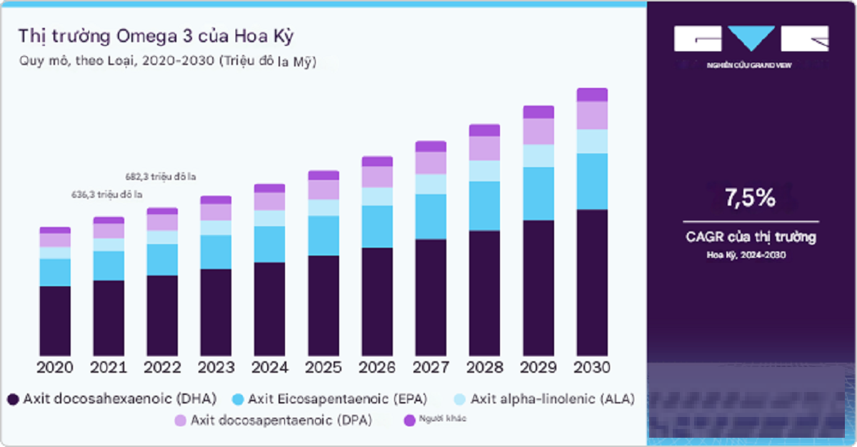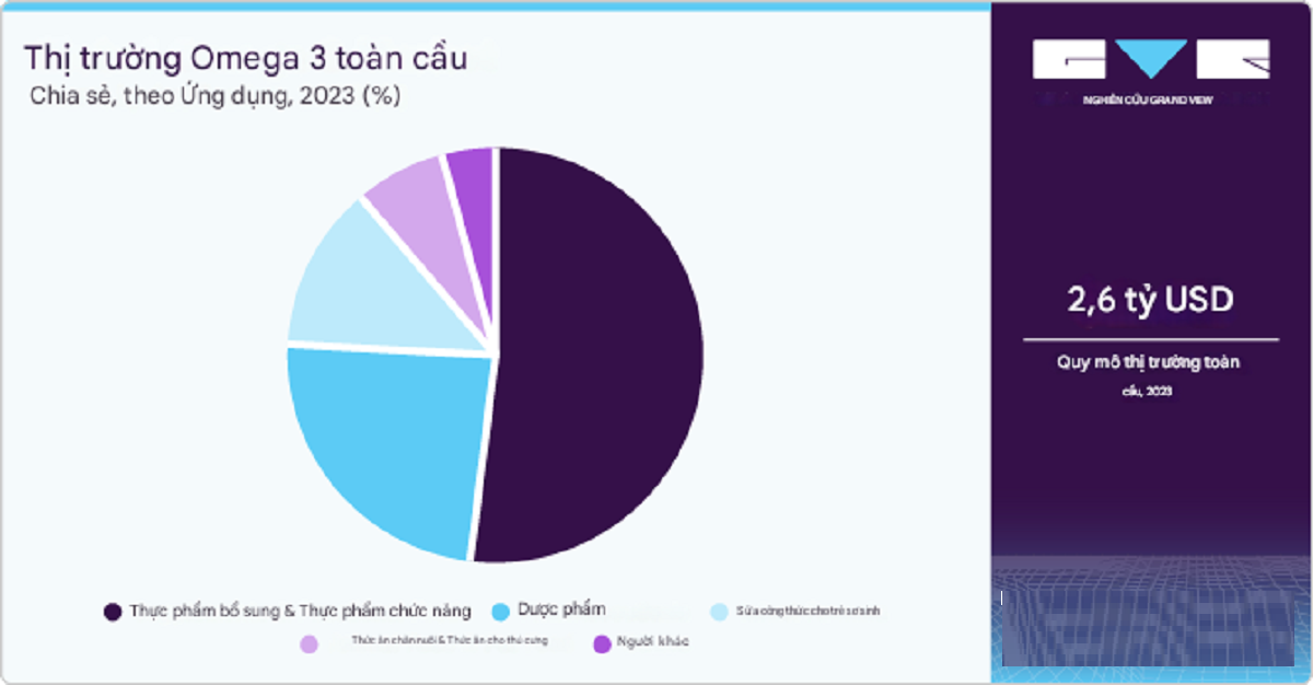 Theo Grand View Research- một công ty nghiên cứu và tư vấn thị trường có trụ sở tại Hoa Kỳ, thị trường omega 3 toàn cầu được định giá ở mức 2,62 tỷ đô la Mỹ vào năm 2023 và dự kiến sẽ tăng trưởng với tốc độ tăng trưởng kép hàng năm (CAGR) là 7,9% từ năm 2024 đến năm 2030.