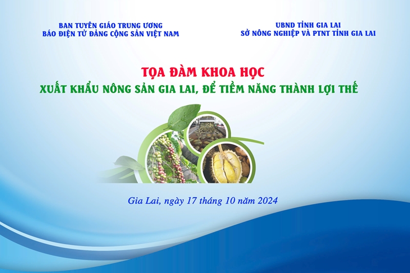 Chiều 17/10/2024 tới đây, tại thành phố Pleiku, tỉnh Gia Lai, Báo điện tử Đảng Cộng sản Việt Nam phối hợp cùng Sở Nông nghiệp và Phát triển Nông thôn Gia Lai sẽ tổ chức Tọa đàm “Xuất khẩu nông sản Gia Lai, để tiềm năng thành lợi thế”.