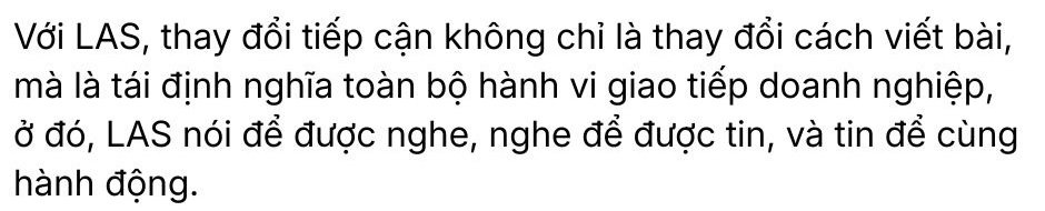 Tóm lại, với LAS, đây không chỉ là thay đổi cách viết bài, mà là tái định nghĩa toàn bộ hành vi giao tiếp doanh nghiệp, ở đó, LAS nói để được nghe, nghe để được tin, và tin để cùng hành động.