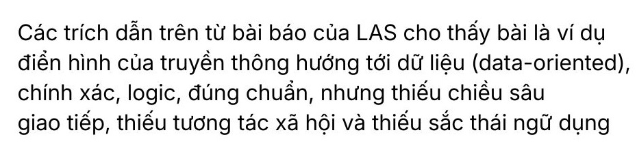 Các đoạn vừa dẫn phản ánh cấu trúc trình bày cực kỳ tuần tự – logic – báo cáo hóa. Cấu trúc như vậy phù hợp với mục tiêu “truyền đạt”, nhưng thiếu hàm ý “thích ứng với ngữ cảnh giao tiếp”, yếu tố cốt lõi trong ngữ dụng học.