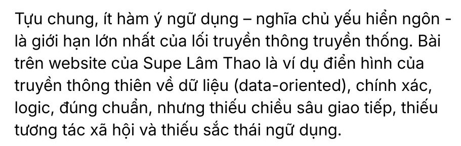 Khi đọc kỹ bài trong đường dẫn của website supelamthao.vn, có thể nhận thấy đây là mẫu truyền thông truyền thống thiên về dữ liệu (data-oriented communication), kiểu truyền thông chú trọng thông tin, dẫn chứng, số liệu, thay vì đi vào chiều sâu của ngữ cảnh, tương tác, và hàm ý xã hội. Dưới đây là năm đặc điểm nổi bật của kiểu truyền thông này trong bài.