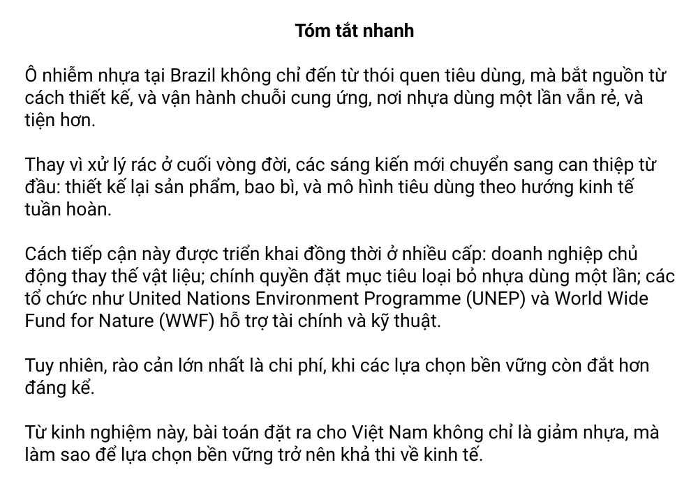 Ô nhiễm nhựa không còn là câu chuyện môi trường thuần túy, mà trở thành bài toán kinh tế và quản trị. Tại Brazil, nơi tiêu thụ hơn bảy triệu tấn nhựa mỗi năm, các thành phố ven biển như Salvador đang thử nghiệm cách tiếp cận mới: giảm nhựa dùng một lần thông qua kinh tế tuần hoàn, dù chi phí thay thế cao hơn đáng kể.